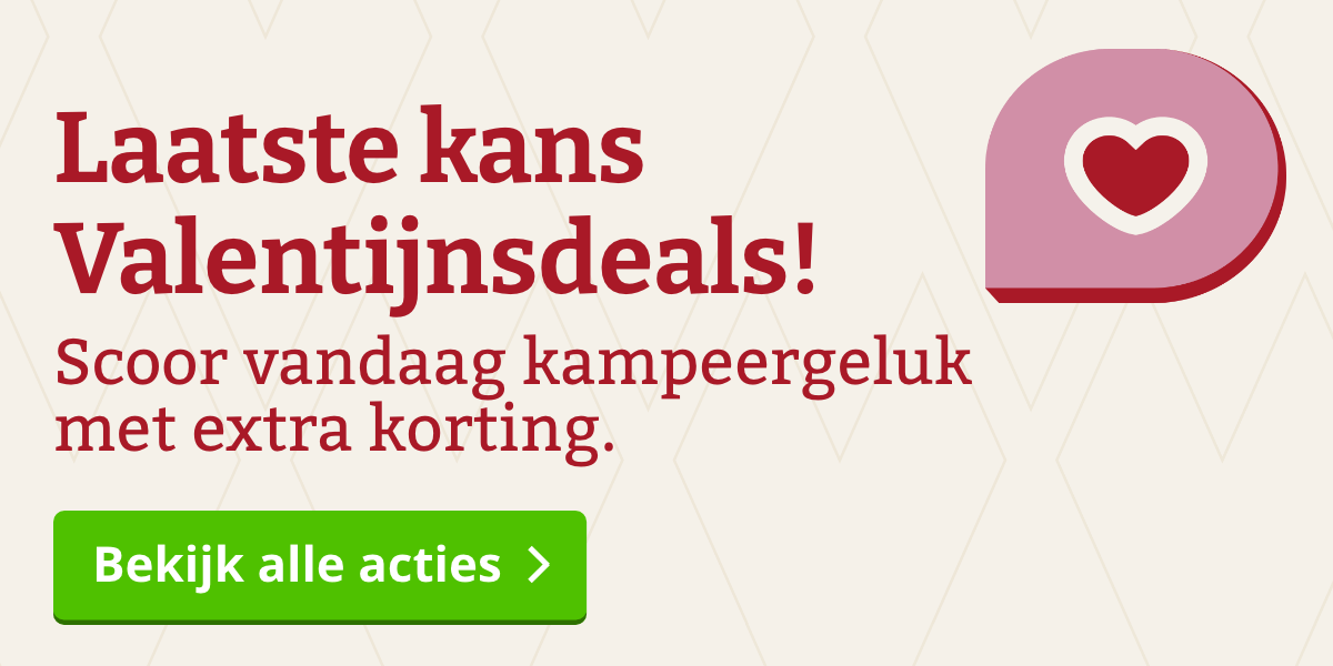 Valentijnsdag is helaas al voorbij, maar voor jou maken we graag nog één uitzondering. Je krijgt van ons nog een allerlaatste kans om te profiteren van kampeergeluk met extra korting.