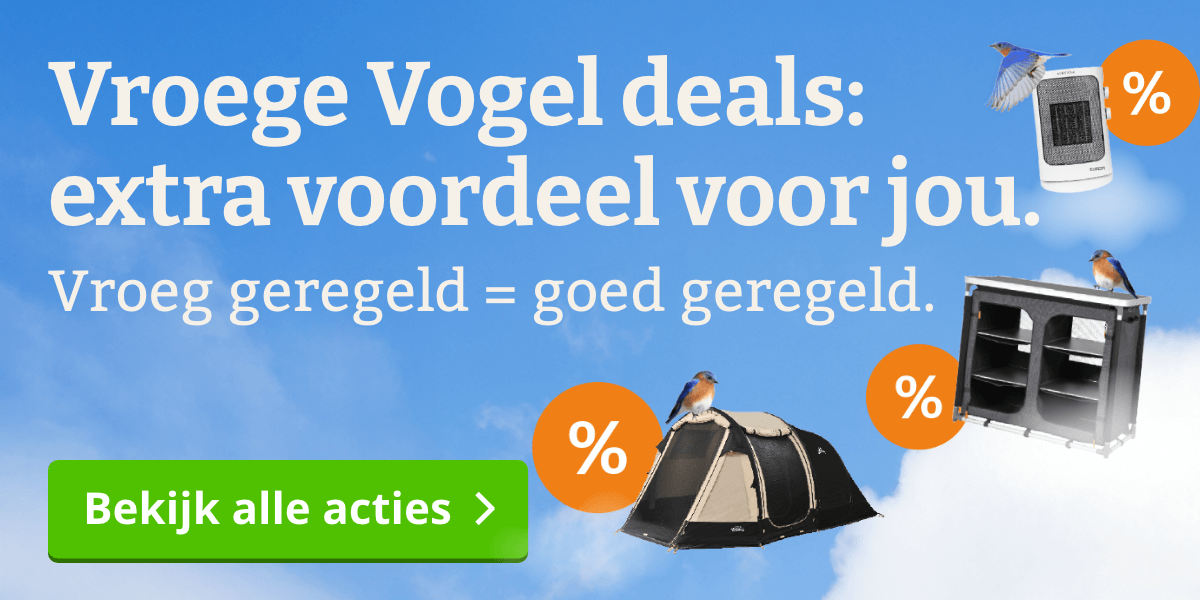 Vorig jaar zagen we het opnieuw gebeuren. Populaire kampeerartikelen vlogen snel de deur uit. Door er nu al bij te zijn shop je rustig, profiteer je van aantrekkelijke Vroege Vogel voordelen en ga je goed voorbereid het seizoen in. |